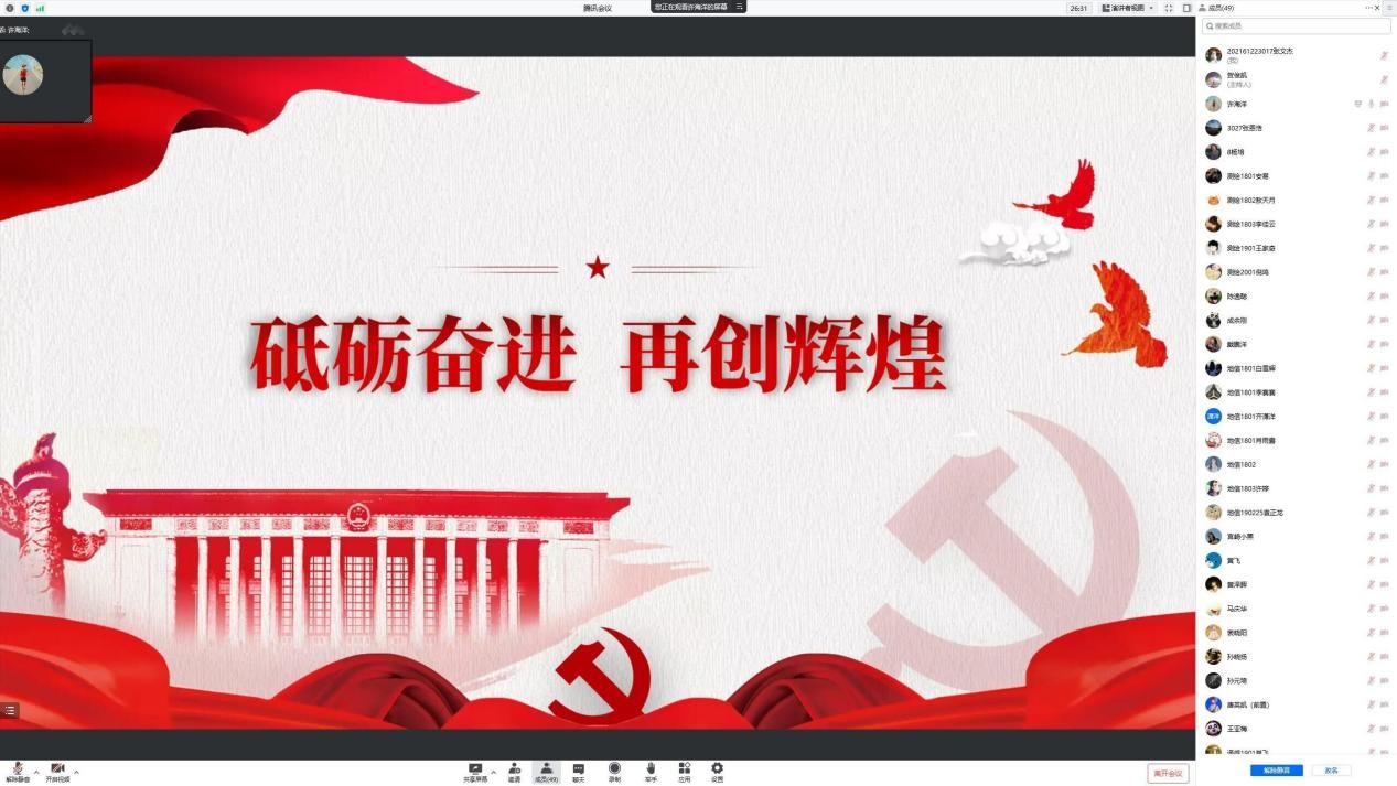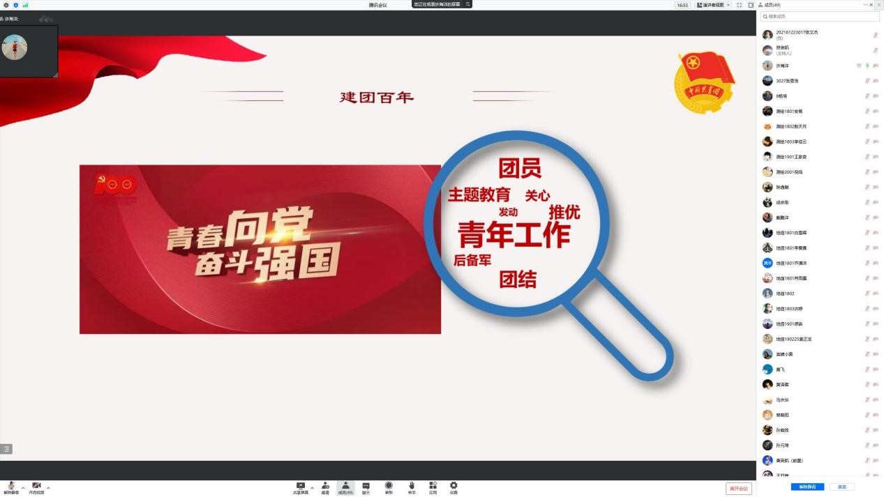 学习会上,全体党员集中观看了习近平总书记在庆祝中国共产主义青年团成立100周年大会的讲话回放,同学们结合自身学习工作情况逐一分享了观看体会和感想。接着,主讲人许海洋同志带领大家学习了习近平总书记考察中国人民大学的重要讲话,呼吁大家要把个人发展的“小目标”融汇在时代发展的大蓝图中,要把家国情怀和锤炼实践能力充分结合起来,永葆精进向上的“能动力”,既要努力让自己成为“一大批这样的先锋分子”中的一员,也要引导更多人成为“一大批这样的先锋分子”。最后,支部书记陈逸聪同志作总结发言,他要求党员同学要深刻认识自己肩负的时代责任和历史使命,不断提高政治觉悟,积极进取,以更加优异的成绩向党的二十大献礼。