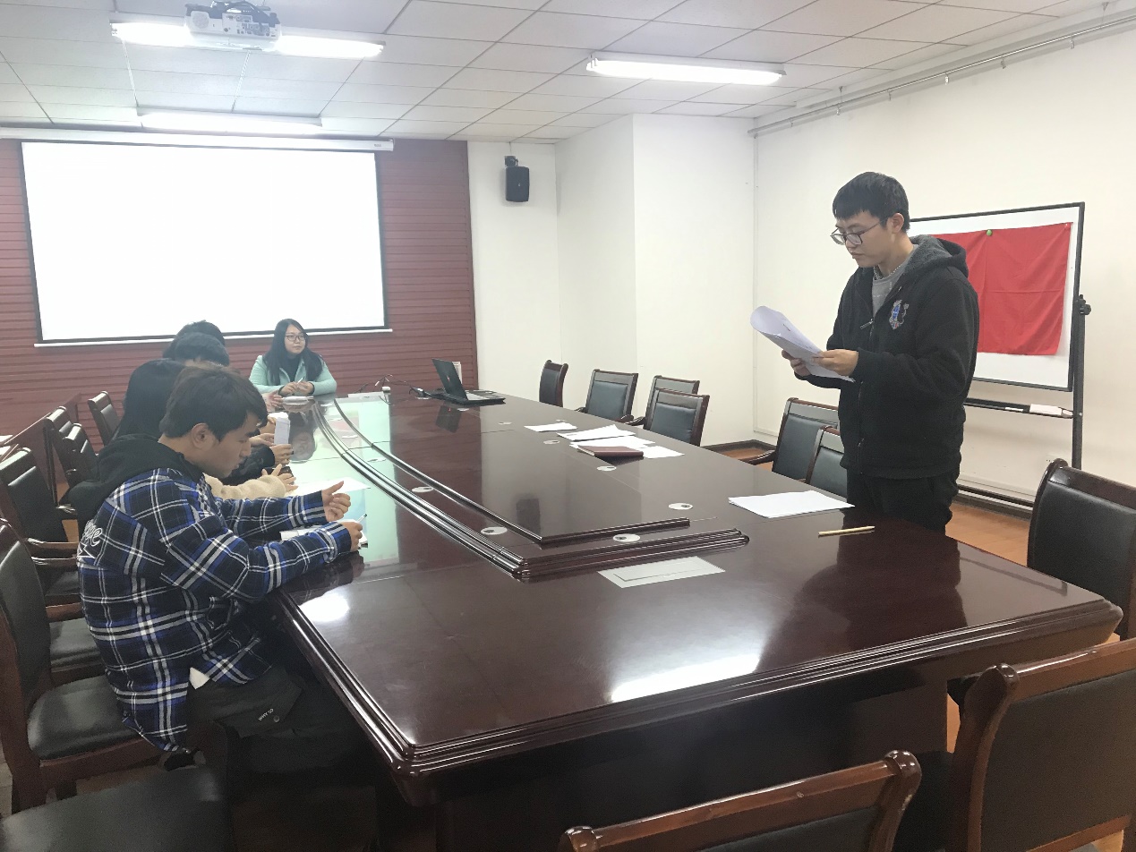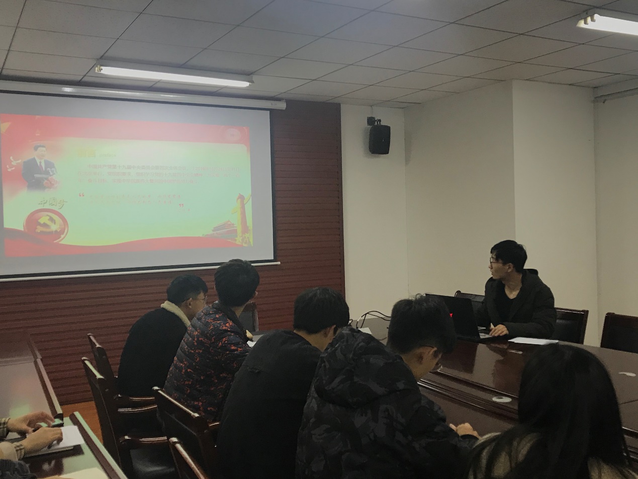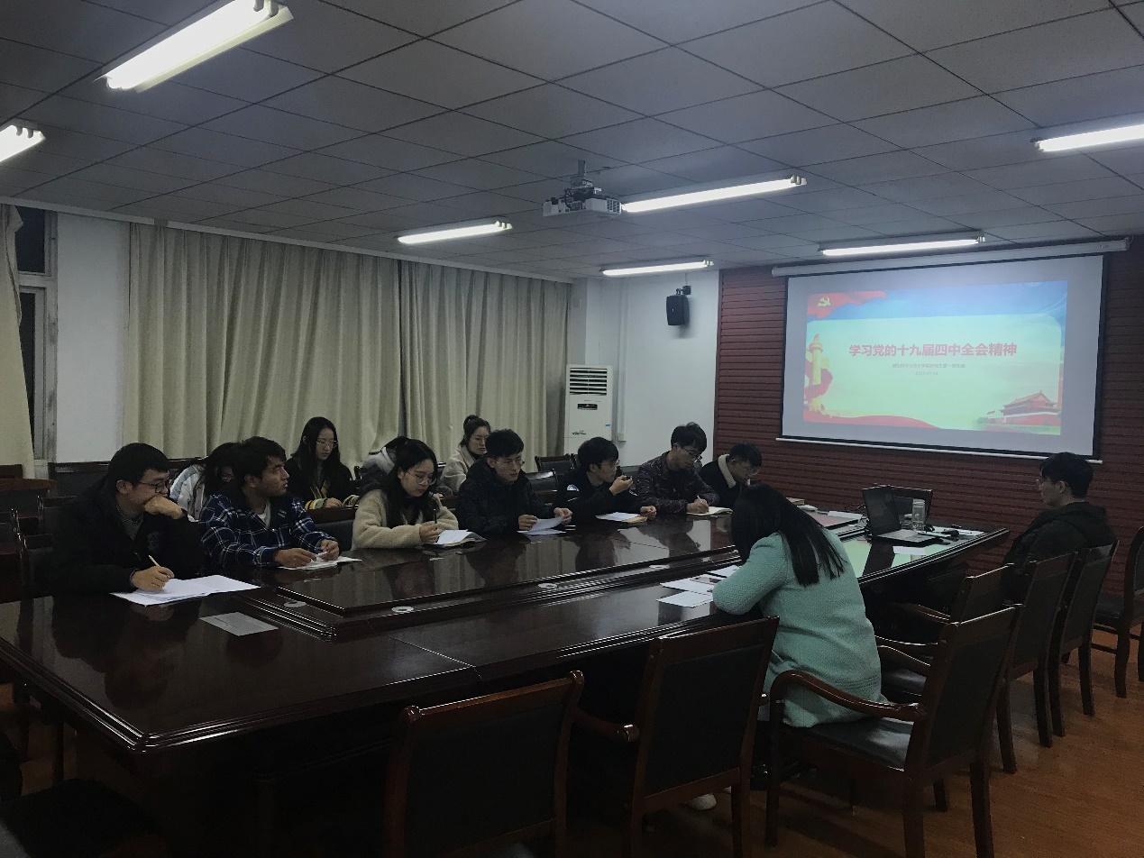 11月20日晚六点半,公司研究生第一党支部开展了学习党的十九届四中全会精神,本次活动在江浦校区天工楼会议室举行,党支部书记许琳同志主持,学院全体党员参加会议,由任高升同志重点发言。