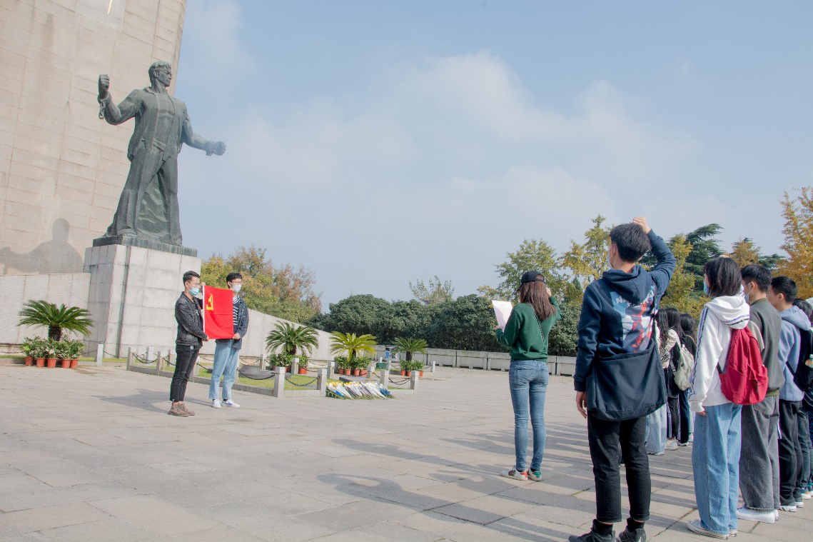 随后,全体党员有序地前往矗立于雨花台顶的雨花烈士纪念碑,列队缓慢地绕圈瞻仰了烈士纪念碑,并集体在肃穆的氛围中表达了对革命英烈的悼念与敬意,随后逐个依次敬献了鲜花。之后,在烈士纪念碑与党旗之前,各成员举手握拳宣誓,重温了入党誓词。集体宣誓后,全体党员就本次活动进行了交流,万老师也希望各党员能通过本次实地学习,牢固自己的精神信念,牢记共产党人的初心使命。
