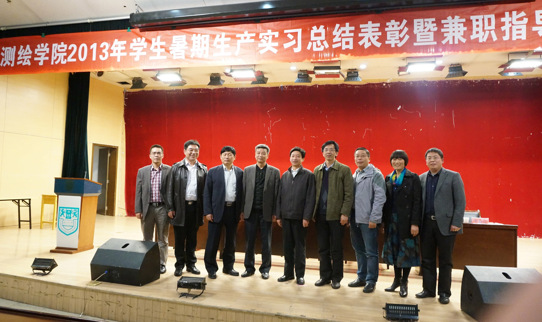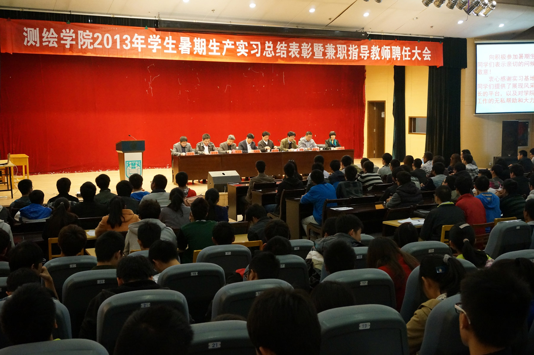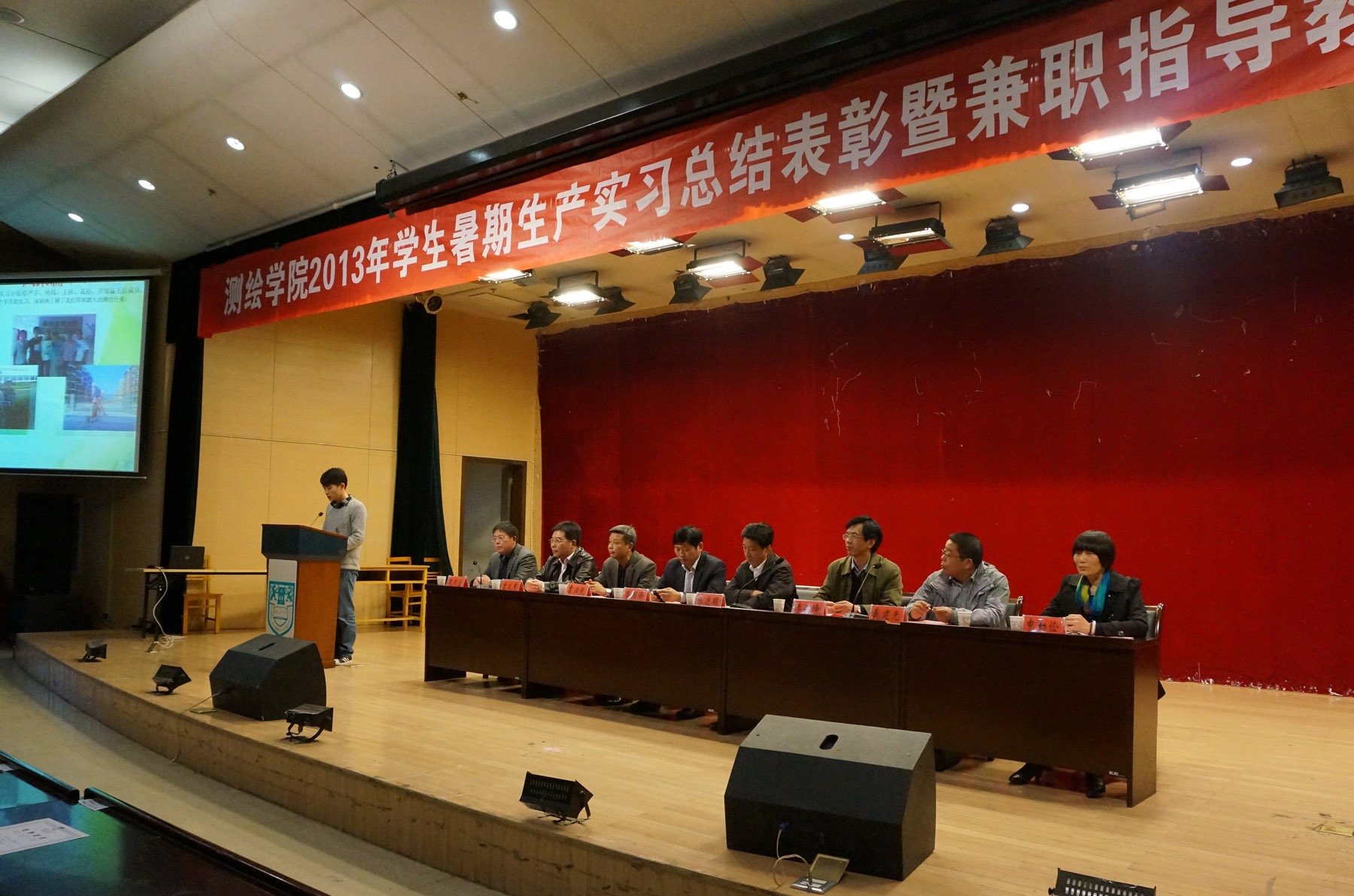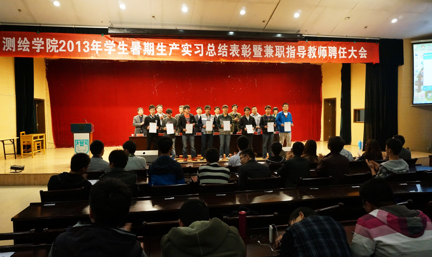 11月15日下午,在江浦校区浦江学院报告厅,学院召开2013年员工暑期生产实习总结表彰暨实践教学兼职指导教师聘任大会,张进明副董事长、教务处管国锋处长、泰州市测绘院曹必武经理、常州市武进规划与测绘院戴建光副经理、学院段然堂书记、李明峰经理、吉文来副经理以及师生代表参加了会议,会议由段然堂书记主持。
