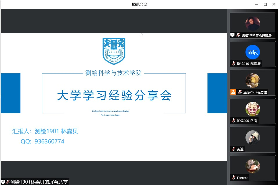 首先由来自测绘1901班的林嘉贝同学分享自己的学习心得,他从如何提升自己来获得推免研究生资格开始讲述,并对同学们提出的问题一一解答。其次,地信1901班薛一纯同学从专业竞赛和科学研究两方面分享个人经验,为同学们答疑解惑,提出学习建议。最后,来自遥感1901班的尤燕玲同学从专业学习及复习技巧两方面入手,具体讲述她自身的专业学习和考试心得。