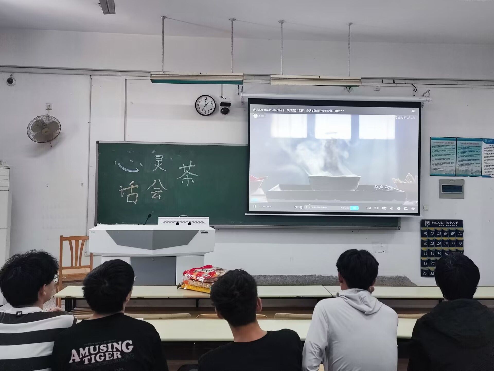 本次茶话会主题是心理观影和心灵交流。期间,大家共同观看了心灵短片《一碗汤面》。故事讲述了母子三人除夕夜来到一家面馆点了一碗汤面,老板看出他们的难处,偷偷地多放了一团面进去,默默地献上自己的爱心。老板不知那碗汤面给了她们母子三人活下去的勇气和一往直前的力量。这个故事告诉我们不要忽视自己对环境的影响,无论什么时候都要心存善念,也许你那份衷心真诚的关怀,虽微不足道却能给予别人无限的光明。最后,大家交流了对这则短片的感悟,也分享了自己遇到的感人故事。