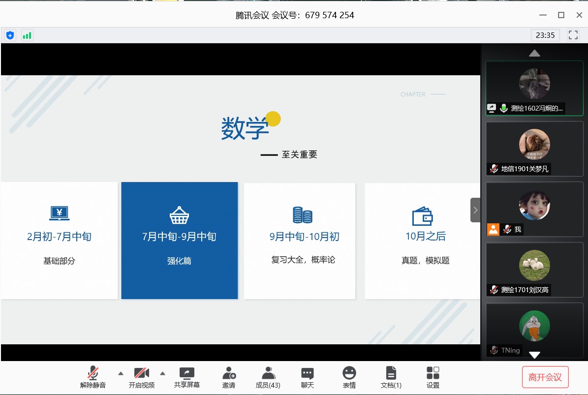 6月13日下午,公司组织了线上考研分享会。本次会议由学习部部长齐梦轩主持,邀请了冯炯、倪臻炜、韩文超、倪上四位考研成功上岸的学长分享自己的考研经验,全体大三员工参加。