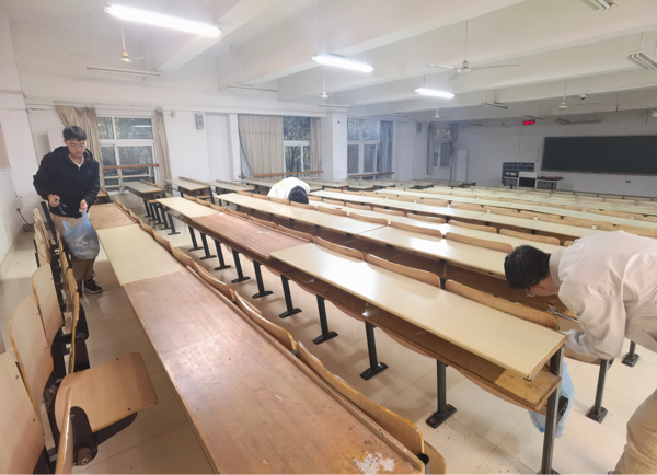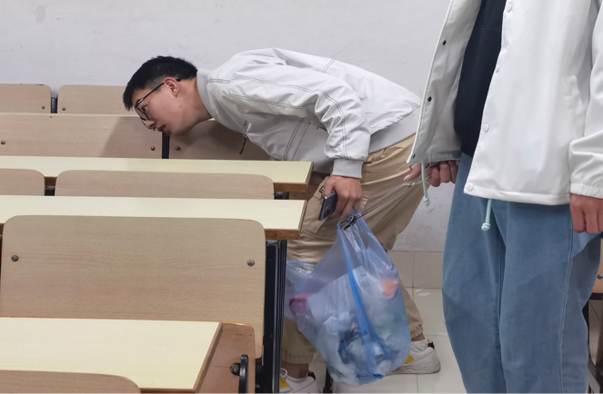 活动前,学院全体员工利用线上、线下多种方式进行宣传,提升员工环保意识并招募卫生检查与卫生开展两类志愿者。活动中,志愿者们对晚自习后的教室进行清理,包括抽屉内垃圾清理、地面清扫和黑板等进行清洁。卫生检查志愿者对自习室同学进行监督,若发现其未自觉带走垃圾,则对其进行教育引导,培养员工们的环保意识与自觉性。