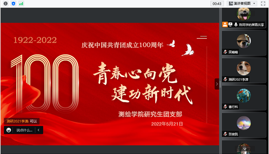 为庆祝中国共产主义青年团成立100周年,喜迎党的第二十次全国代表大会胜利召开,深入贯彻共青团中央“喜迎二十大、永远跟党走、奋进新征程”主题教育,5月21日下午公司研究生团支部组织召开“青春献礼二十大,强国有我新征程”线上主题团日活动。活动由研究生党支部书记陈逸聪同学主持,全体研究生团员、本科生优秀团员代表参加本次活动。