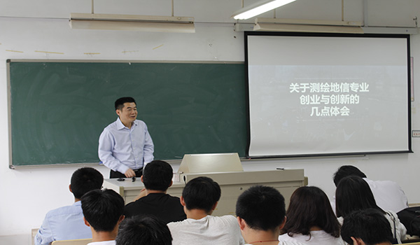 会上,李勇员工结合自己的工作实际,畅谈了自己对创新创业经验和心得体会。他语言风趣,结合现实生活中的场景和案例,从时代背景、市场趋势和自身目标与能力等三个方面与师生进行了分享。李勇员工指出现代社会是一个信息时代,测绘地理信息学科的发展和应用不断深化和多样化,新技术、商业模式的发展、制度创新为学科发展创造了广泛的市场和各种机会,这需要从同学们从大学时代起就要学会定标、定位和定向,在整合和创新中,守正出奇、“图”谋发展;工作中要注重团队、平台和能力建设,做人要担当、有格局,要端正态度、注重细节,态度决定未来,细节决定成败。李勇员工还以自己担任总经理的上海舆图公司的“精工善新,宁静致远”赠言同学们。会场氛围生动。
