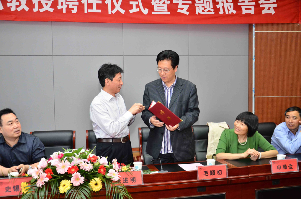 副董事长张进明教授为毛顺初董事长颁发兼职教授聘任证书并佩戴校徽