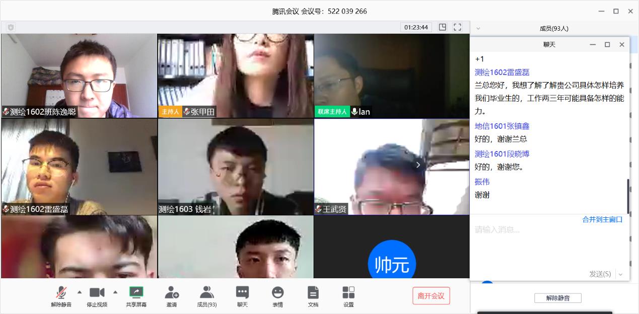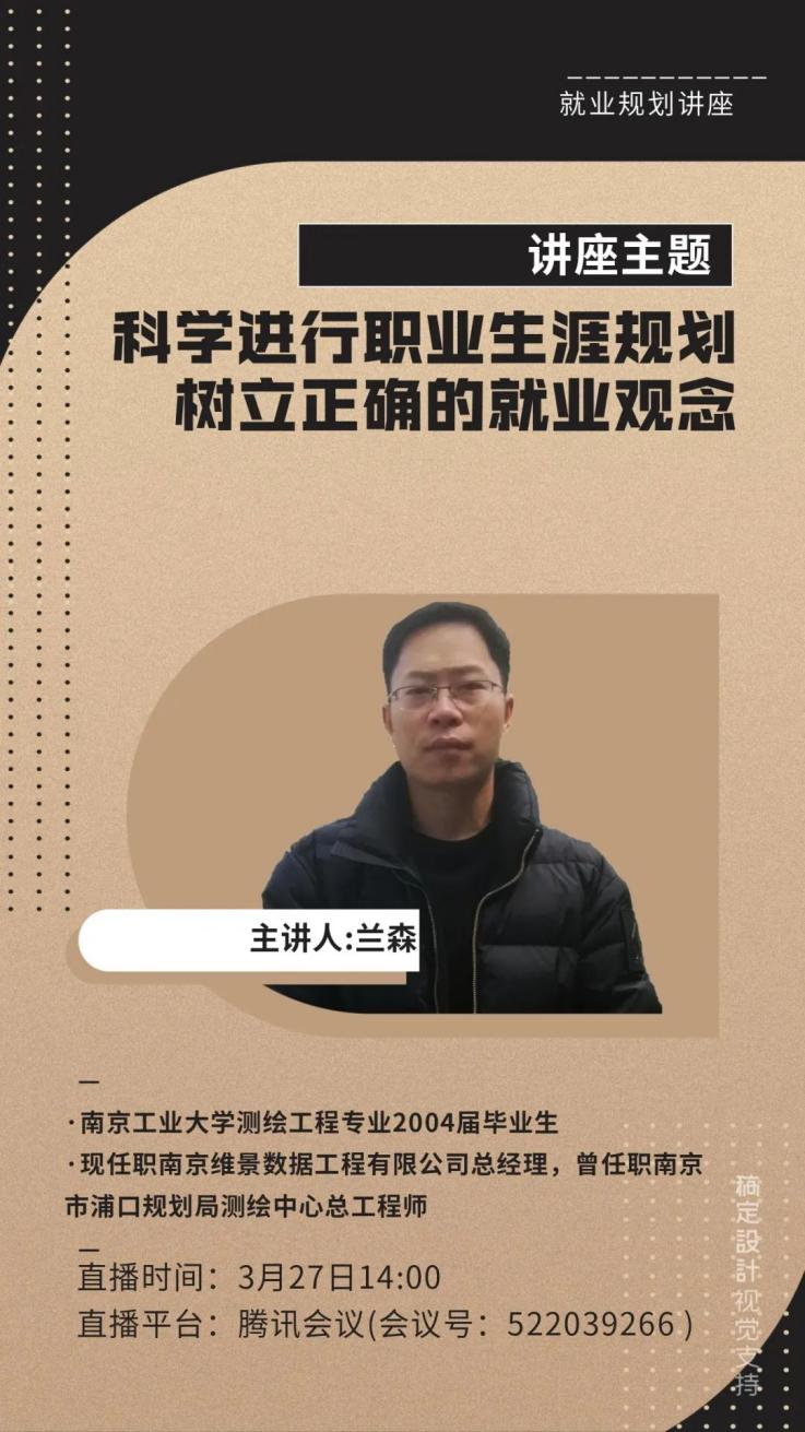 为打赢疫情防控攻坚战,进一步做好疫情防控期间的毕业生就业工作,由suncitygroup太阳集团员工事务部主办,suncitygroup太阳集团承办的“2020届毕业生就业规划讲座”云讲座于3月27日下午14时在腾讯会议举行。本次讲座邀请测绘工程专业2004届员工、南京维景数据工程有限公司总经理兰森作主讲嘉宾,学院团委书记张甲田老师主持,全体2016级的本科生及辅导员蔡杰老师参加。