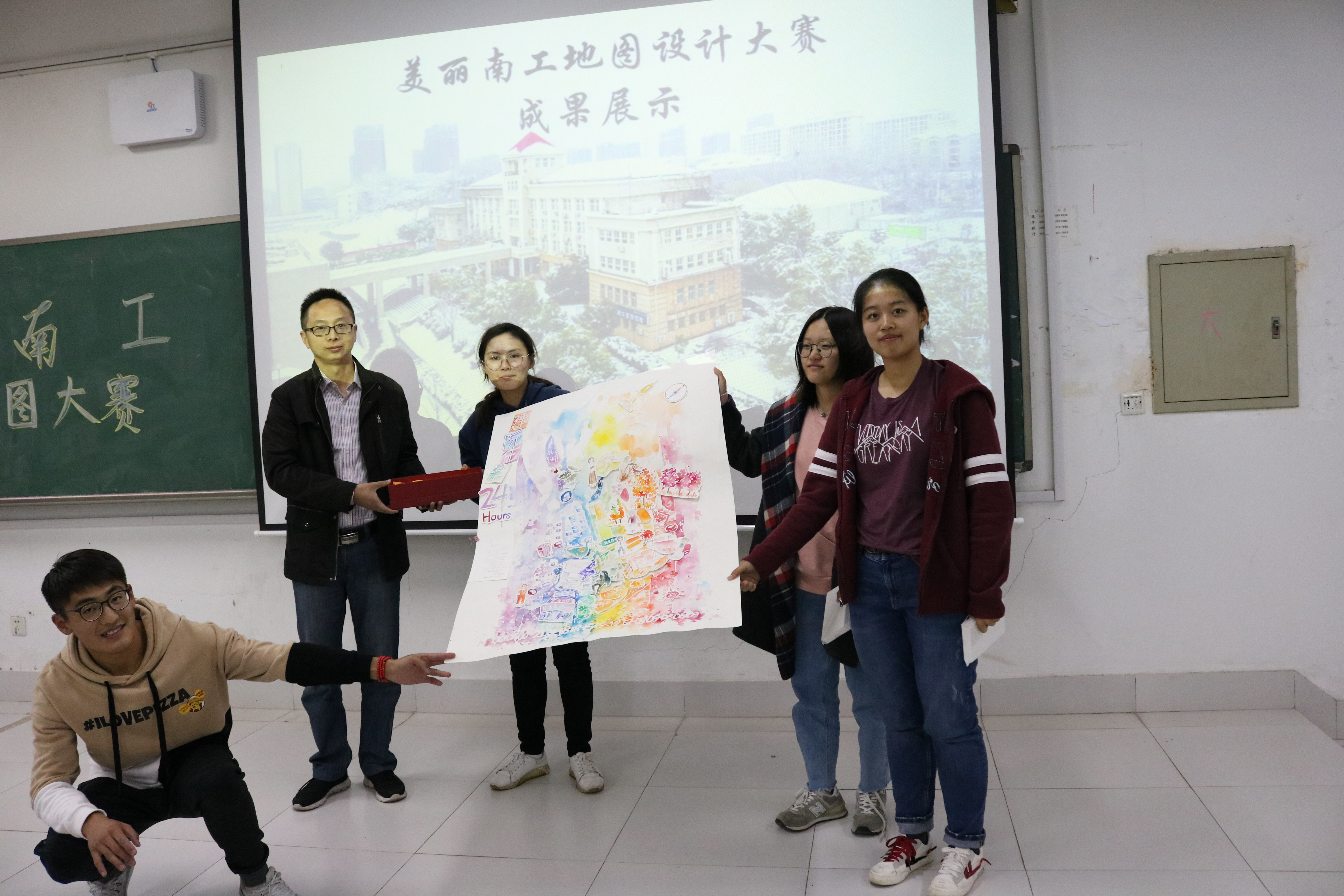 各个小组按顺序上台展示自己的作品,展示过程包括设计背景、创意来源、制作过程、心得体会等等。建筑学院的城规CPU小组以不同的颜色代表一天的不同时间,以学校校园为例,用地图给我们分享了南工学子们一天的生活轨迹,创意无限。suncitygroup太阳集团的“践知”小队则另辟蹊径,通过实地走访,探索校园里的植物种类及分布情况,并用CAD、Photoshop等软件将其成果绘制成图。各小组精彩展示结束后,评委老师进行了点评,充分肯定了同学们的参与热情和参赛选手们的专业素养,精彩纷呈的作品与展示体现了同学们的创新精神。最终,评委们从现场展示、作品设计、地图规范性三个方面综合打分评比出了本次大赛的一二三等奖。