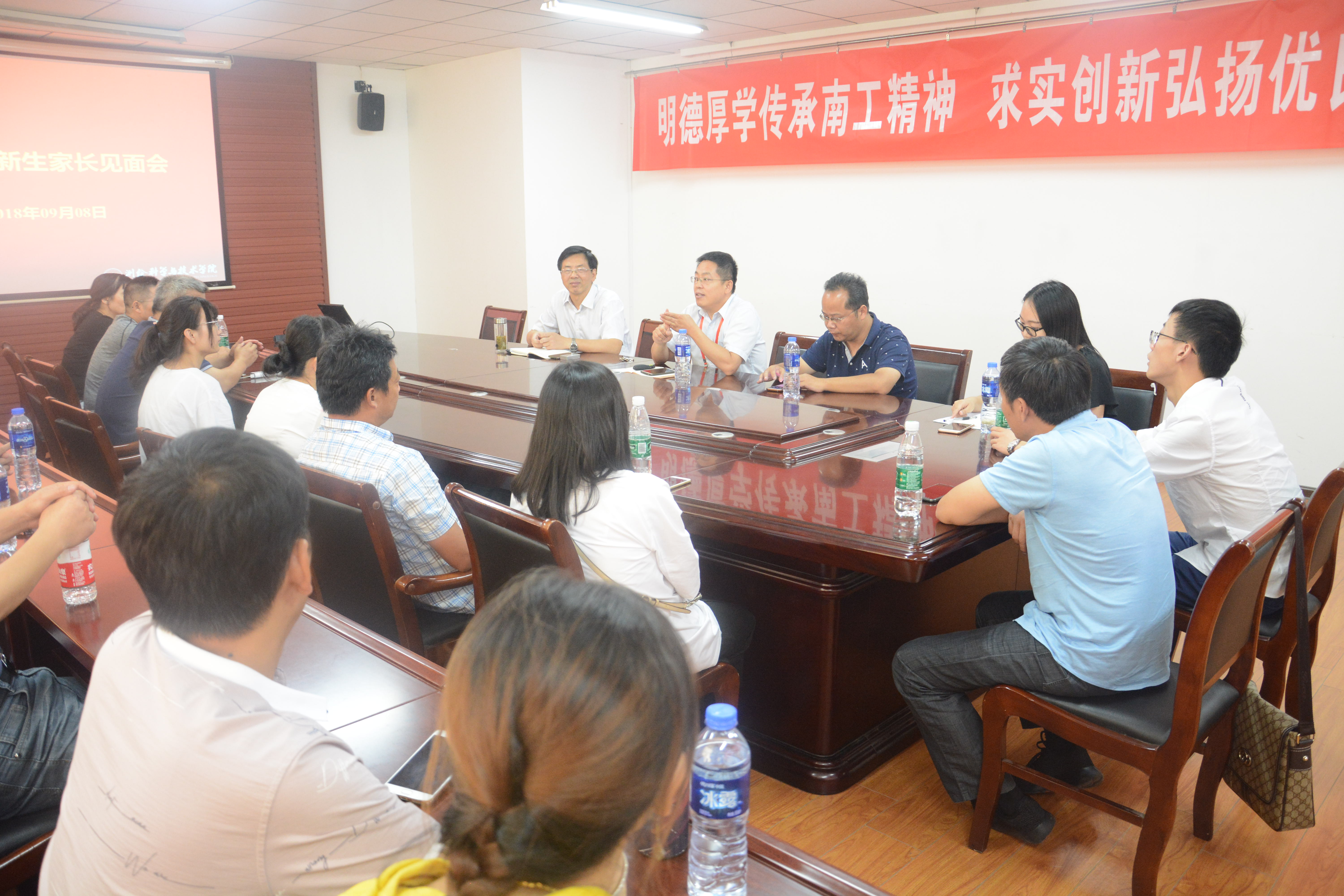 9月8日下午2:30,公司在天工六楼会议室召开了2018级新生家长见面会。经理李明峰教授、党委书记段然堂老师、学办主任蔡杰老师、新生辅导员许琳老师及近50位新生家长参加了此次交流会。会议由段然堂书记主持。