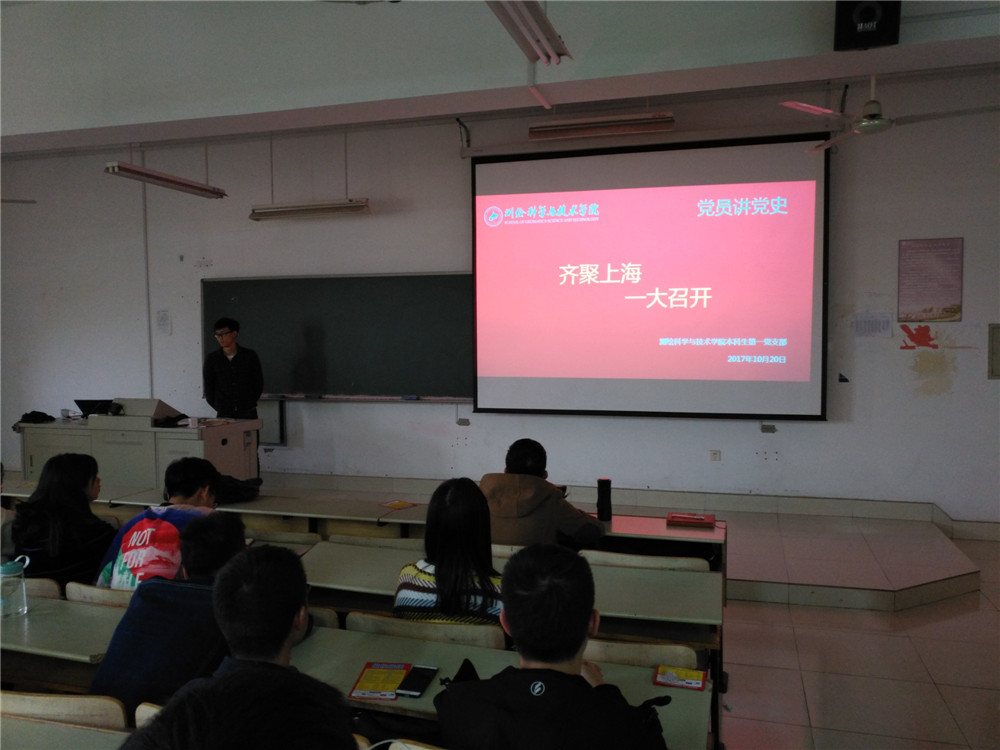 会议开始,我们观看了中国共产党第十九次全国代表大会开幕会的重播。接下来,由王子涵同学给在座的各位同学讲中国共产党党史,主要介绍了较为重要的几次党代会和十九大的背景意义、会议流程等。