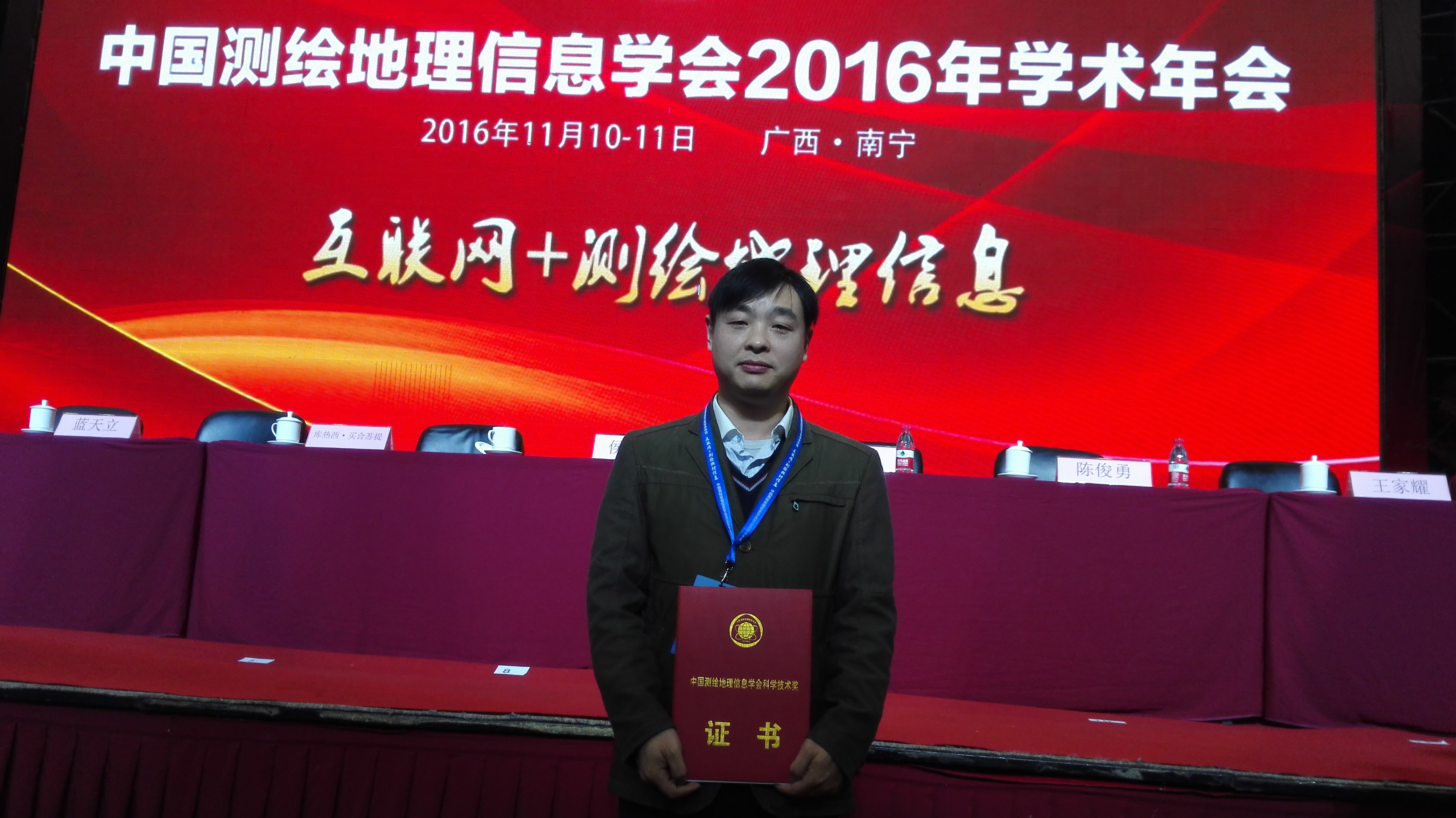 11月10日,中国测绘地理信息学会以“互联网+测绘地理信息”为主题的2016年学术年会在南宁会展中心盛大开幕,开展重要行业奖项的颁布及业内专家的特邀报告会。在颁奖环节中,表彰了2016年测绘科技进步奖、优秀地图作品裴秀奖、全国优秀测绘工程奖、自主创新产品奖、青年优秀论文奖、夏坚白院士测绘事业创业奖,徐敬海副教授参会并领奖。