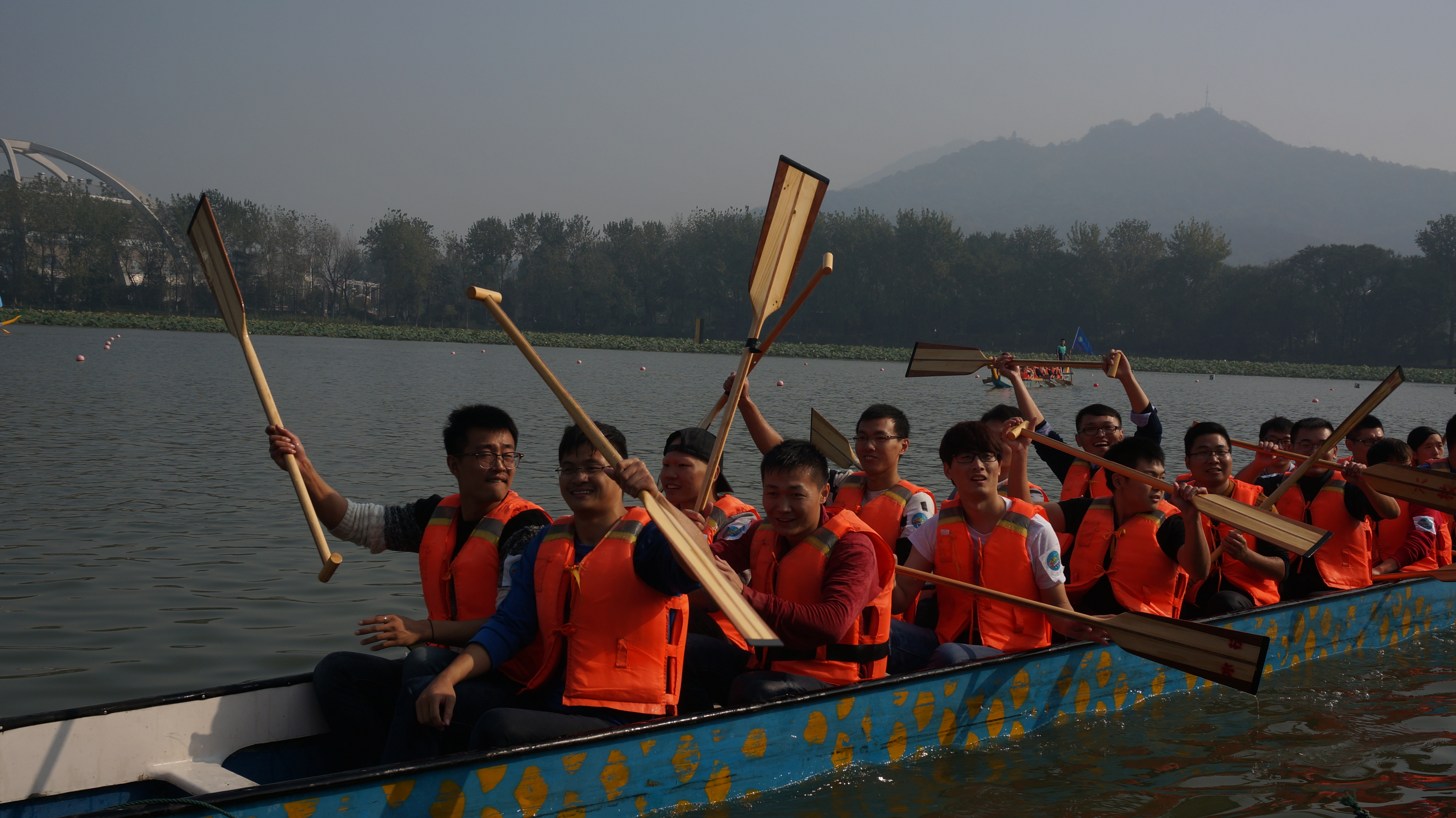 上午9时20分,16支队伍依次出场进行预赛,测绘-法学联队的21名队员齐心协力,俯身、插桨、划桨、拔桨一气呵成,连贯有力,经过奋力拼博,获得了小组第二名的好成绩,顺利晋级决赛。决赛中,经过紧张而激烈的角逐,测绘-法学联队,最终获得第五名。队员们赛出了风格,赛出了水平,展现了研究生的青春活力。