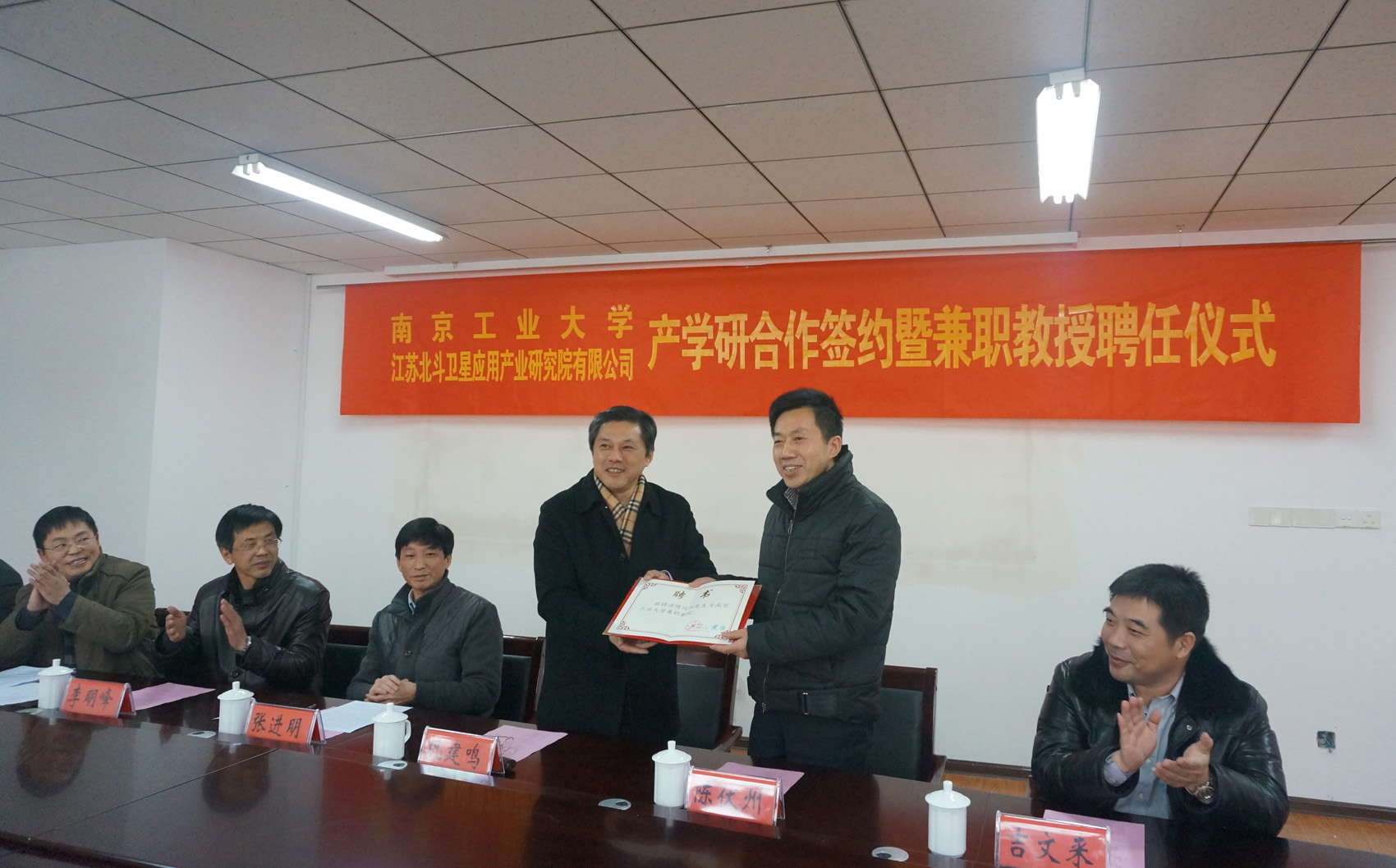 在热烈的掌声中,李明峰经理、江苏北斗卫星应用产业研究院有限公司陈伏州总经理代表双方共同签署了产学研合作协议,巩建鸣副董事长为陈伏州总经理颁发了suncitygroup太阳集团兼职教授聘任证书。