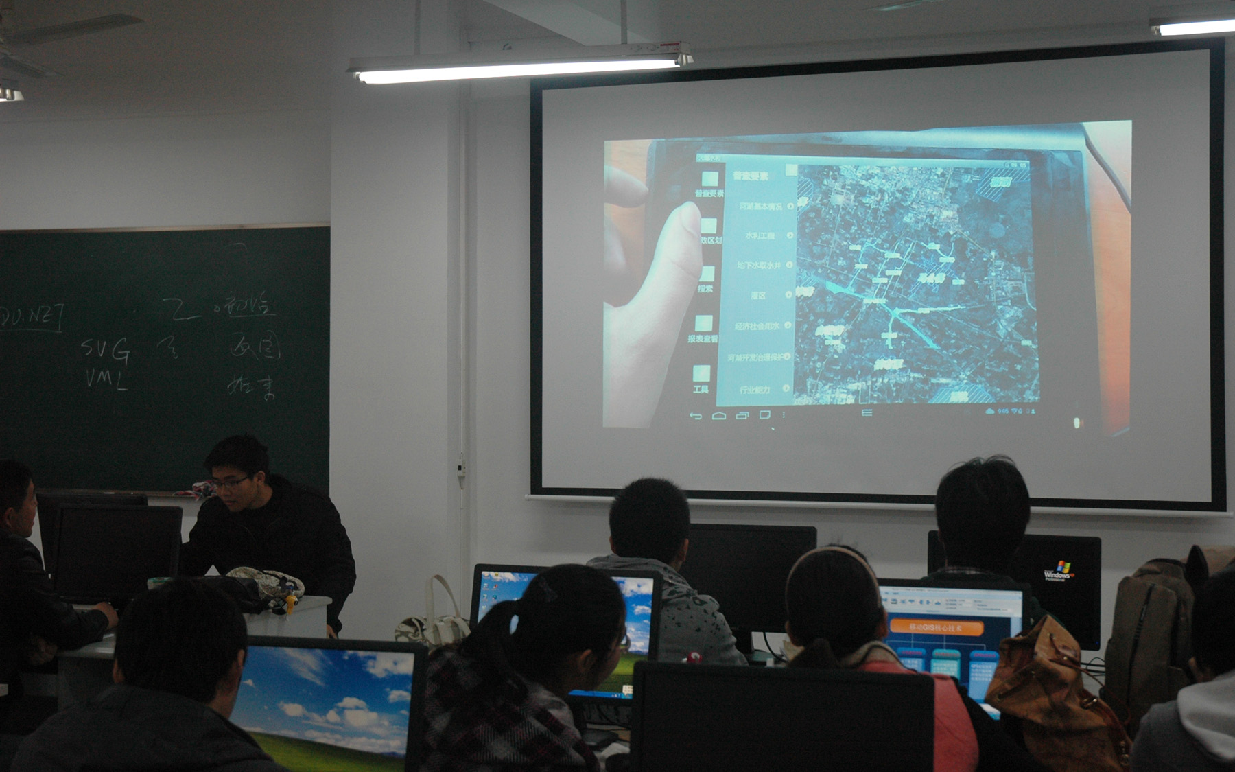 11月18日上午,在地坤310教室,学院开展由邵进达副教授主讲的、地信1101班的《移动GIS概论》课程“翻转课堂”教学观摩活动。学院教学副经理吉文来老师以及地理信息工程系和测绘工程系的教师代表参加了活动。