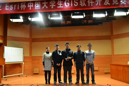 大赛开设了Web应用开发组、桌面应用开发组、空间处理与建模组和ENVI/IDL开发组四个组别。入围总决赛的Web应用开发组和桌面应用开发组的参赛员工经过系统讲解、Demo演示、现场答辩、专家评议等环节的激烈角逐,最终由公司徐敬海、袁博老师指导,罗震霄、施越、艳楠、黄一城四名同学组成的团队,凭借作品“基于地理微博的社区POI动态评价与查询系统 ”,获得Web应用开发组一等奖。