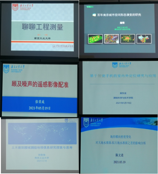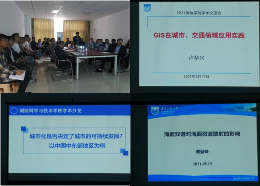 徐敬海经理率先为本次学术交流活动开讲,做了题为“土木建筑领域测绘地理信息研究探索与思考”的学术报告,结合实际的工程和科研项目,分享了测绘地理信息在实际工程领域应用方面仍存在的问题和挑战。随后,吴东金、谢登峰、石银涛、卢华兴、李海星、陈文进、张荣庭和施歌等九位老师详细介绍了智能手机室内定位、海面微波散射特性、什么是工程测量、GIS及其在智慧城市中的应用、生态环境与城市化水平耦合关系、大地水准面与似大地水准面确定、遥感影像配准、南京城市空间形态变化等各自研究领域的进展。