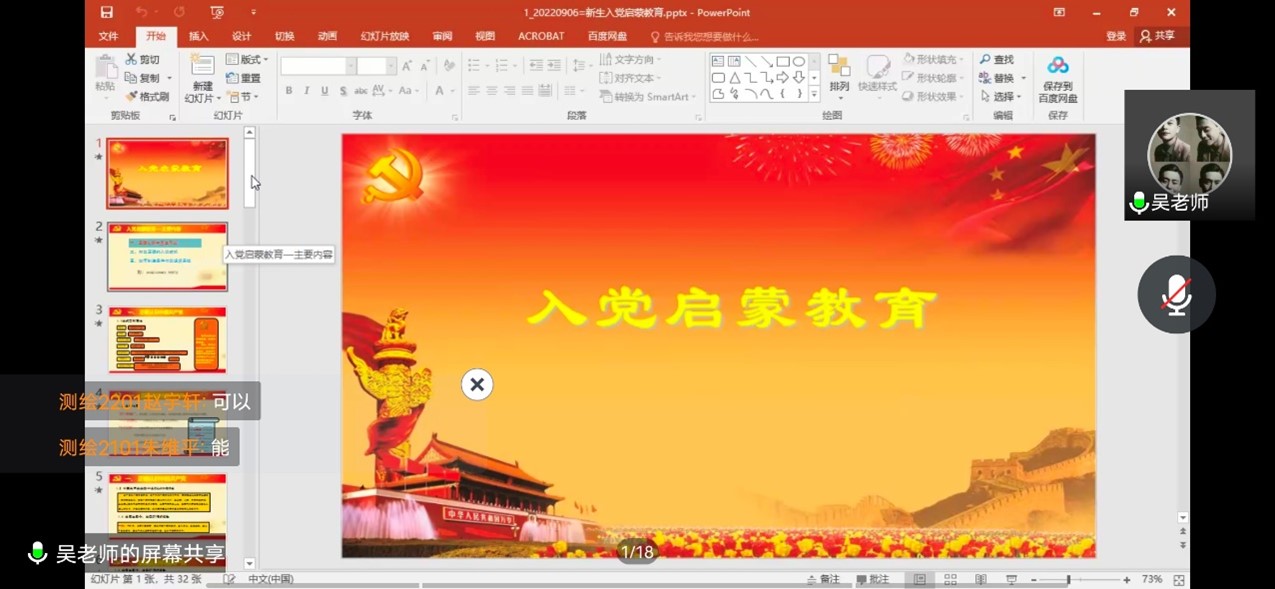 为帮助新生了解党的基本知识,明确入党动机,9月8日下午公司采取线上的形式举行了入党启蒙教育。学院专职组织员吴倩老师主讲,2022级全体新生参加会议。