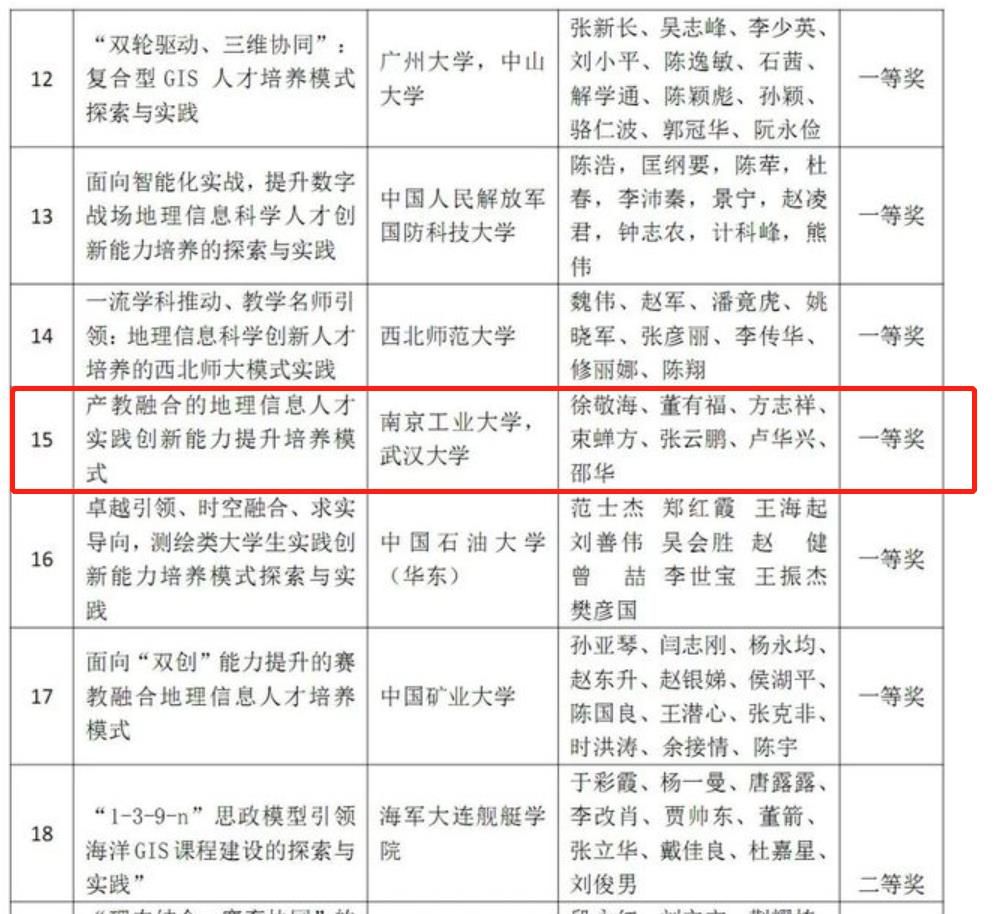 2023年6-7月,中国地理信息产业协会教育与科普工作委员会主办了第四届全国高校GIS教学成果奖评选,经过评审委员会网评和现场答辩会评等环节,最终评出特等奖4项,一等奖13项,二等奖21项。学院经理徐敬海教授领衔完成的教学成果“产教融合的地理信息人才实践创新能力提升培养模式”荣获一等奖。