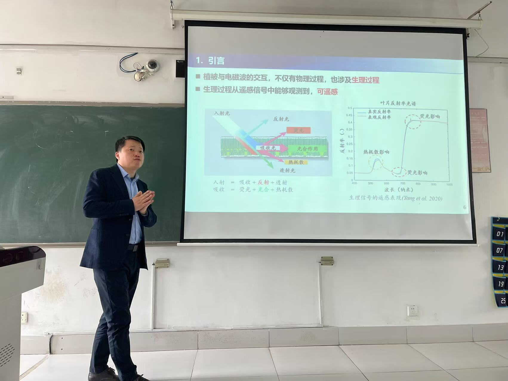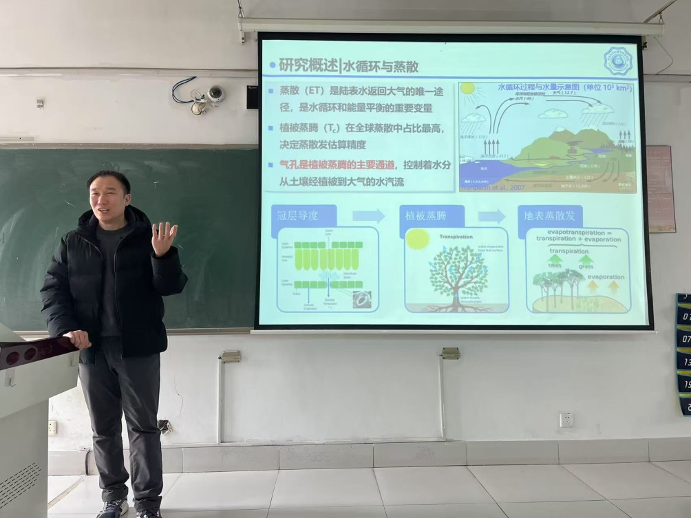 杨沛琦教授为大家介绍了植被光合作用的过程,详细讲解了植物吸收能量的三种归宿:热耗散、光合作用和荧光,特别强调了荧光信号的重要性,介绍了SIF(日光诱导叶绿素荧光)的反演过程及与叶黄素相关的光化学反射指数在植被生理遥感中的原理和应用。金佳鑫教授介绍了“导度-光合(GS-A)”模型,提出了两种改进方法:一是根据叶面积指数的变化调整模型中的常数,使其随季节变化;二是利用SIF值驱动模型,以解决冠层导度敏感性问题。通过这些方法,可以计算出导度斜率,进而与植被蒸腾建立联系,最终生成全球蒸散发产品。江冲亚教授在报告中介绍了农业遥感数据获取的挑战与解决方案,提出利用模型预测全球农作物生长情况,并通过低成本方法获取大量地面数据,分享了通过相机拍摄和智能识别技术计算叶面积指数;通过周期性车载地面拍摄来监测收割进度等农业遥感应用实例。