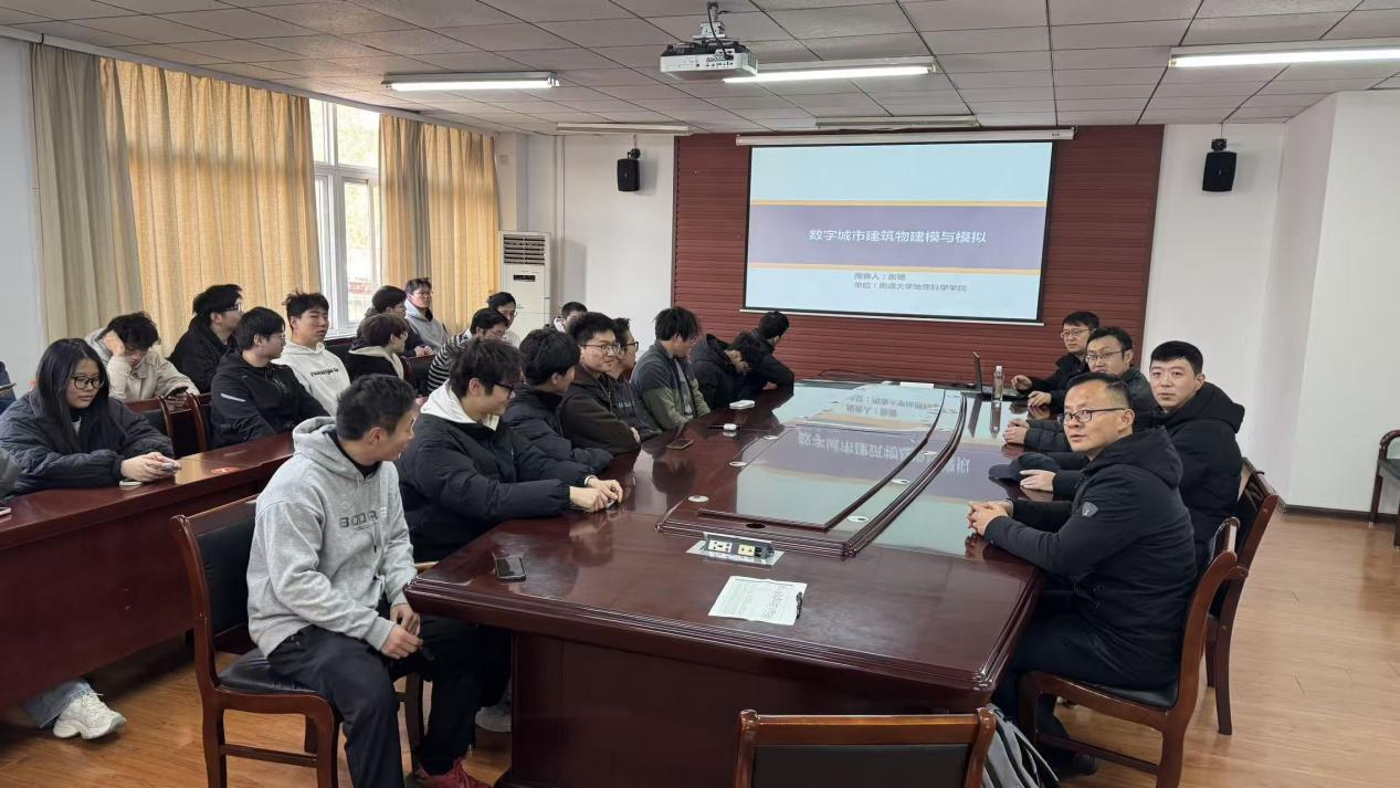 张驰副教授多年从事GIS三维建模与模拟研究,其内容丰富的学术报告让在场师生受益匪浅。他系统梳理了建筑物三维建模的发展趋势、先进的建模方法以及三维建筑的应用方向。重点阐述了智慧城市建设中,建筑物三维建模的需求内涵,强调了人工智能、大数据、点云分析等前沿技术在建筑物三维建模领域的深度融合与应用,并就如何开展相关研究和人才培养模式等方面提出了前瞻性的建议。报告会结束后,师生们围绕建筑物三维建模等议题展开了深入交流。